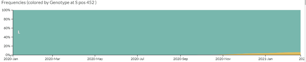 This variant carries three mutations, including l452r, in the spike protein, which the virus uses to attach to and enter cells, and is the target of the two vaccines that are l452r. This mutation was one of the first documented in the united states in the initial stages of the pandemic, after having initially circulated in europe.